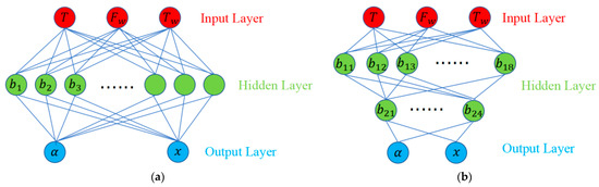 The structure of the proxy model based on the BP neural network is shown in Figure 10. As shown, each layer contains several neurons. The first layer is the input layer which contains three inputs of moment , wind load , and wind moment . The middle layer is the hidden layer, and the last layer is the output layer, where a represents the maximum equivalent stress and x represents the maximum deformation [17,18]. The hidden layer is generally one or two layers. The one hidden layer (Figure 10a) can approximate any function that contains a continuous mapping from one finite space to another, while the two hidden layer (Figure 10b) can represent an arbitrary decision boundary to arbitrary accuracy with rational activation functions and can approximate any smooth mapping to any accuracy. Increasing the number of network layers will enhance the fitting ability of the network, but will increase the training difficulty, and more likely bring about the problem of overfitting.