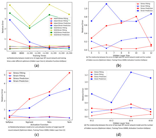 (a) Relationship between model error of single-layer BP neural network and training times under different optimizers (Hidden Layer Size = 4, Activation Function = Softplus); (b) Relationship between model error of single-layer BP neural network and the number of hidden neurons (Optimizer = Adam, Training Times = 10,000, Activation Function = Softplus); (c) Relationship between model error and activation function of single-layer BP neural network (Optimizer = Adam, Training Times = 10,000, Hidden Layer Size = 12); (d) Relationship between model error of double-layer BP neural network and the number of hidden neurons (Optimizer = Adam, Training Times = 10,000, Activation Function = Softplus).