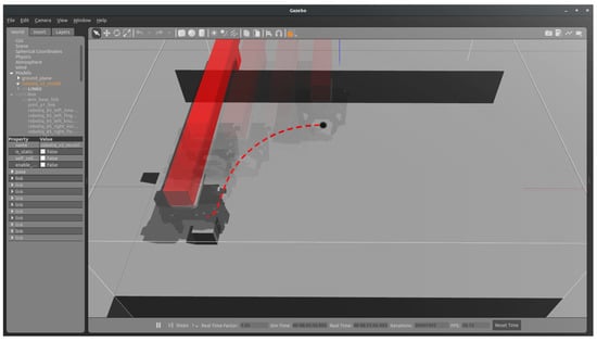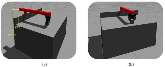 As was mentioned in Section 1, we designed a 2-DoF robotic arm moving in a 2D space equipped with a ROBOTIQ gripper, i.e., a two-finger gripper. The above design was exploited for a manipulation task as presented in Figure 1. Both of the robot’s joints are prismatic, while the origin was set at the center of the table. The entire experiment was realized using a robot operating system (ROS) and the Gazebo simulator. The first joint () moves horizontally in the range of (−0.45 m, 0.45 m), indicating the table’s width in meters, while the second joint () moves vertically within the range of (0.00, 0.70 m), indicating the table’s height. Thus, the robotic arm’s movements always lie inside the table’s borders. As far as the gripper is concerned, we only controlled the left finger since we implemented a mimic joint Gazebo plugin where the right finger mimicked the exact movement of the left one.