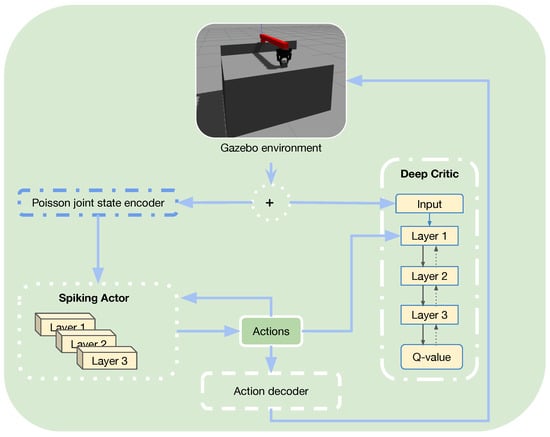 Regarding the simulation configurations, the target object was placed randomly within the borders of the table and it was equipped with contact sensors. Subsequently, the agent could detect the object’s position and orientation, the contact between the target object and the table’s surface, and the contact between the target object and the end effector during grasping. We implemented a hybrid actor–critic training approach using the DDPG method to control the robotic system. The employed spiking actor network calculated and provided the agent’s actions, and the deep critic network was responsible for evaluating the actor, as illustrated in Figure 2.