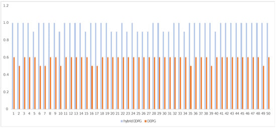 The average success rate of the hybrid DDPG model vs. the classical DDPG model for 50 trials in 10 different starting and goal positions. Blue bars indicate the hybrid DDPG, while orange bars refer to the classical DDPG.