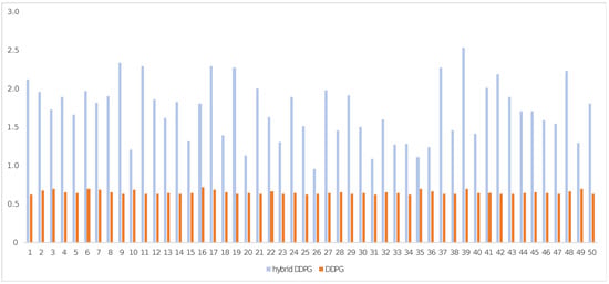 The average execution time of the hybrid DDPG model vs. the classical DDPG model for 50 trials in 10 different starting and goal positions. Blue bars indicate the hybrid DDPG, while orange bars refer to the classical DDPG.