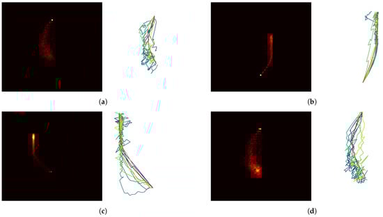 The obtained results from the hybrid DDPG model with the spiking actor. Each subfigure corresponds to a particular starting pose and target-object position of the robot, along with the path that the agent generated to solve the task. (a–d) Heat map and a graph.The heat map summarizes the evaluation results from 50 trials for the box-reach subtask, while the graph depicts 10 paths randomly selected from the 50 paths of the heat map, along with a red line indicating the desired target path.