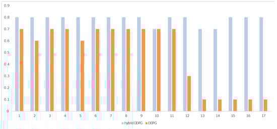 The average success rate of the hybrid DDPG model vs. the classical DDPG model for 17 trials in 10 different starting and goal positions. Blue bars indicate the hybrid DDPG, while orange bars refer to the classical DDPG.