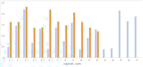 The average execution time of the hybrid DDPG model vs. the classical DDPG model for 17 trials in 10 different starting and goal positions. Blue bars indicate the hybrid DDPG, while orange bars refer to the classical DDPG.