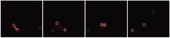 However, this approach was unable to solve the ending task of the target-object transfer. To be clearer, in Figure 11, we present the results obtained from the end-to-end learning scheme. The yellow circle indicates the robotic arm’s starting pose, the white box indicates the box’s position and the green circle refers to the desired target position of the box. Figure 11 aggregates the results from 50 trials in 4 different sets of values for the robotic arm’s initial pose, the position of the box, and the desired target position. As one can observe, even in the cases where the network learnt to successfully approach the target object, it subsequently failed to properly grasp it, and was thereby unable to transfer the box to the desired goal position and complete the task. The above observations, after extensive experimentation and trials, drove our research to a hierarchical approach by dividing the entire challenge into two self-contained subtasks as was extensively described in Section 3.