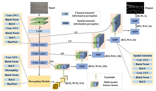 Recently, CNNs have made significant breakthroughs in several fields such as target detection and image segmentation [2,3], which eliminate the need for manual feature extraction, thus achieving a higher accuracy and better robustness compared to traditional machine learning algorithms. Consequently, researchers started to apply it for the crack image classification task. Silva et al. [4] have used Visual Geometry Group (VGG16) as the base model and tuned the learning rate and the number of nodes in the fully connected layer to achieve good results in the crack classification task. Owing to the increasing demand, the classification task alone cannot meet the practical needs, and therefore, the crack image detection and segmentation task have become the focus of research. However, the extraction of the semantic information of crack images in complex backgrounds is crucial, which affects the accuracy of detection and segmentation. Therefore, the fusion of semantic information under different modalities becomes the focus of research. For example, Tang et al. [5] have employed the migration learning for assisting in the network training and data enhancement, for the case of insufficient crack image samples that is combined with the front-end fusion approach. This is for the multimodal fusion to fuse the learned multiple feature data into a single data input to a multi-task enhanced RPN (Region Proposal Network) model to generate the candidate frames. The application of a multimodal fusion mechanism in the crack detection task effectively complements the semantic information extracted from different modalities, and it facilitates the removal of confusing candidate frames from images. The Fully Convolutional Network (FCN) network proposed by Long et al. [6] has shown great potential in semantic segmentation networks. Thereafter, several researchers have proposed certain improved semantic segmentation network models based on this approach, such as Jenkins et al. [7], who have used deep fully Convolutional Neural Networks (CNNs) to achieve pixel-level classification of cracked images. Furthermore, owing to the increasing difficulty of crack image segmentation arising from the variable application scenarios, the research is no longer limited to semantic information fusion in multimodality and has delved into the incorporation of multiscale information into multimodality. Therefore, Ronneberger et al. [8] have incorporated the multiscale information into the decoder stage of the feature extraction and restored the original image information through progressive up-sampling, which has achieved tremendous success in the field of medical image segmentation. Henceforth, Lau et al. [9] have replaced the encoder of U-Net with ResNet-34 network and added the channel attention mechanism to each module to obtain the crack feature extraction capability. To further obtain semantic information at different scales, Choi et al. [10] have incorporated a spatial pyramid pooling module in the decoder stage to fuse the semantic information at different scales, which is a medium-term fusion approach.