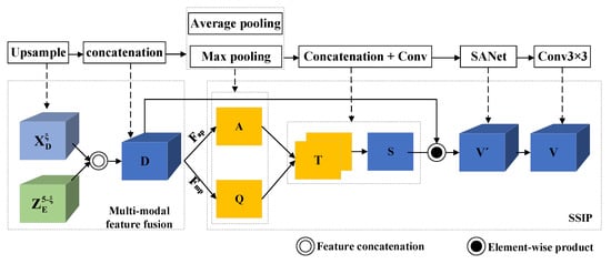 (3) This paper proposes a spatial semantic information perception (SSIP) module and a multimodal feature fusion (MMF) module with respect to the problem of detail information loss during up-sampling, where the spatial semantic information perception module employs the difference in the spatial position of the feature information at different scales. Furthermore, it employs the spatial attention mechanism [15] to extract the rich spatial position feature information at different scales. The multimodal feature fusion module employs the channel and spatial semantic information learned at different scales to fuse with the corresponding level of the encoder [16] and restores the loss and resolution of the context information during up-sampling with respect to the coupled channel and spatial correlation.