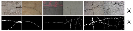 The DeepCrack dataset includes a total of 537 RGB pavement crack images and the corresponding ground truth, 384×544 pixels, RGB channel characterized by small shadows, dense stains, and other noises. The sample of the dataset is displayed in Figure 5.