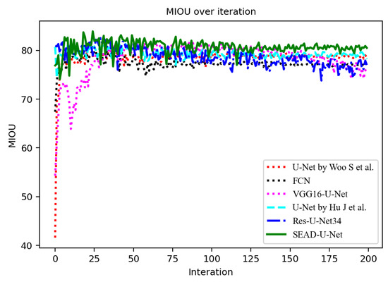 where TP is a true positive example; i.e., the model correctly predicts the positive category sample as a positive category. TN is a true negative example; i.e., the model correctly predicts a negative category sample as a negative category. FP is a false positive example; i.e., the model correctly predicts a negative category sample as a negative category. It is predicted as a positive category, and FN is a false negative example; i.e., the model incorrectly predicts a positive category sample as a negative category. Concurrently, we have added mean intersection over union (MIOU) to evaluate the model segmentation effect. This is a standard evaluation metric for the segmentation problems, which calculates the overlap ratio of the intersection and union of two sets [33] as