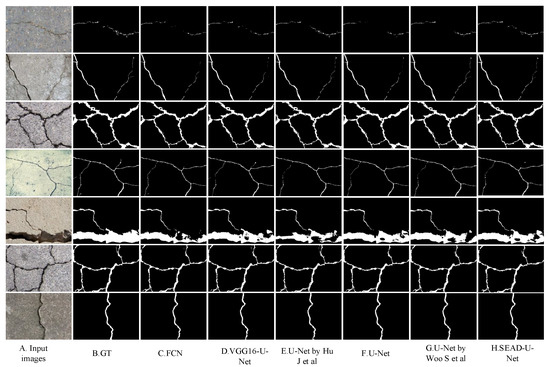Our model is compared with other related models, including ResU-Net34, U-Net by Woo et al., U-Net by Hu et al., VGG16-U-Net, and FCN, to verify the effectiveness of our method in the crack segmentation task. The quantitative comparison results are shown in Table 2, using the hand-labeled CCIC fracture dataset.
