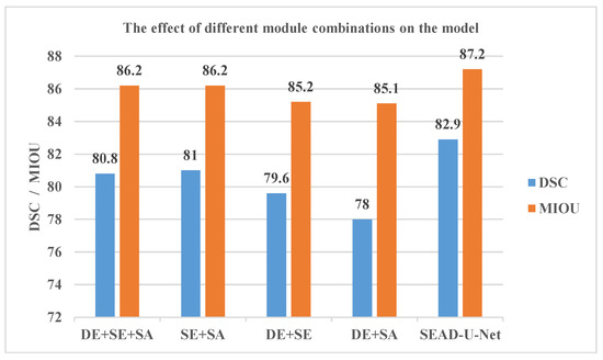 The Dice Similarity Coefficient (DSC) is a set of similarity measurement functions, and X and Y are the prediction results and ground truth, respectively. In the image segmentation task, it is usually employed to calculate the similarity between the prediction and the label, and the value range is between [0, 1]. According to Equation (13), it should have the same value as . However, the error value in the experimental results, owing to a protection parameter set in the experiment to prevent the output NaN, has been employed as an evaluation index.