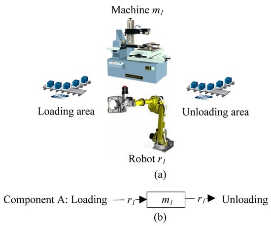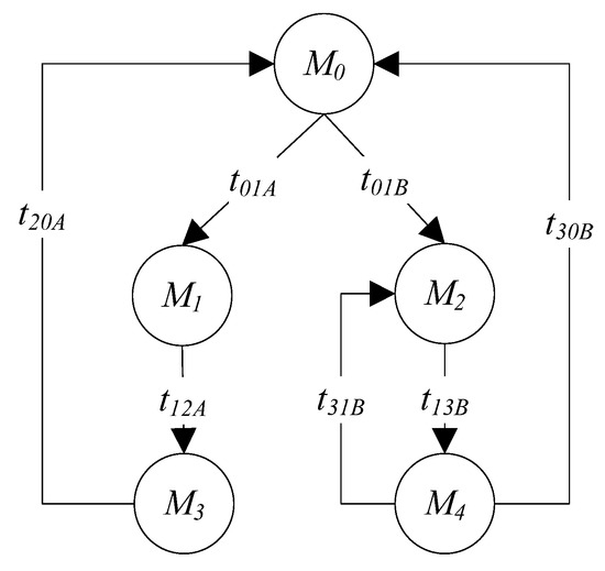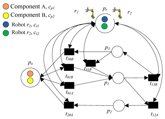 The initial states of the developed CROPN are Mo(po, p1, p2, p3, pr) = Mo({cp1, cp2}, 0, 0, 0, {ct1, ct2}), where cp1 and cp2 indicate, respectively, that raw components A and B are available at load/unload station po; ct1 and ct2 denote, respectively, robots r1 and r1, which mean that the robot r1 is idle and can transport the raw component A and the robot r2 is idle and can transport the raw component B; and Mo(p1) = Mo(p2) = Mo(p3) = 0, which mean that the machines m1–m3 are free and available to process raw components. In addition, the following describes the process routes of the components A and B: