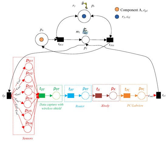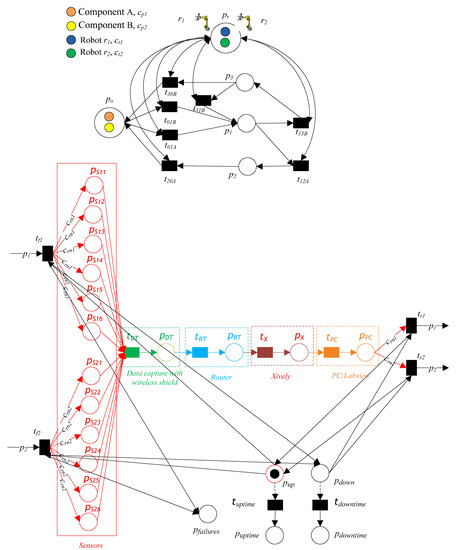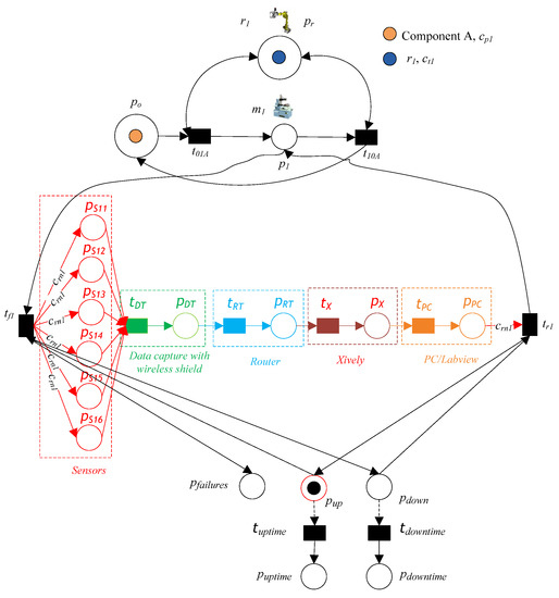 19]. Because a single sensor cannot accurately determine the status of a tool under varying operational conditions, combining the data from multiple sensors can be the main obstacle. Using information that is partially redundant, this data acquisition can provide decision-making information for a process with less uncertainty. Earlier solutions attempted to derive a tool’s status from data by extracting relevant characteristics. Therefore, this study aims to propose a “colored resource-oriented Petri nets” (CROPNs)-based IoT for sensor systems in order to detect and remedy failures. Using the main CROPN properties, we are able to construct a system with a huge number of sensors. The study’s purpose is to present a technique for modeling reliability, based on CROPN and IoT, to identify critical reliability measures in AMS, including “mean time to failure”, “mean time to repair”, and “availability”. First, a CROPN that considers “resource failures” is designed to guarantee the liveness of the CROPN. Then, a method is developed for “fault detection and treatment” that integrates IoT and CROPN to ensure the system’s reliability. Moreover, the system’s reliability is evaluated using CROPN and IoT. The following is a list of the significant contributions of the study:
