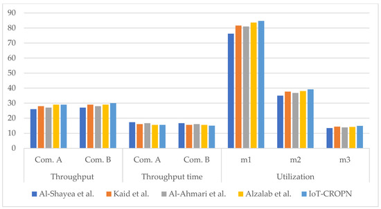 36], where the same conditions and parameters were used for all studies. In terms of “throughput”, “throughput time”, and “utilization”, the results show that the IoT-based CROPN outperformed the other approaches. Moreover,
