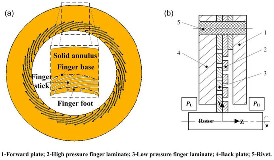 The finger seal structure is illustrated in Figure 1. One finger sheet element (Figure 1a) is machined by a circular annular sheet, which comprises a series of flexible curved finger sticks. There are gaps between the adjacent finger sticks to make the flexible finger sticks follow the rotor’s motion better. Several finger sheet elements are sandwiched (Figure 1b) by rotating one finger sheet element relative to its adjacent element in order to make each finger stick cover the gap of its adjacent element. Finger elements are clamped by the forward plate and back plate and fixed with rivets at the solid annulus.