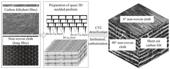 The C/C composite disk sliding against the steel pin was used in the tribological test. The preparation process of the C/C composite is as follows (Figure 2) [26]. PAN-based carbon fiber (T700) was used, with each yarn containing 12,000 filaments. The C/C composite preform was manufactured and prepared by laminating the 0° carbon non-woven cloth (unidirectional carbon fabric), 90° carbon non-woven cloth, and the carbon felt (short fibers) and then needling in the laminated direction. Each carbon fiber unit (carbon non-woven cloth and carbon felt) had a thickness of about 0.5~0.8 mm. This kind of preform matches the good in-plane properties of 2D composites and the high delamination resistance of multidirectional composites. The preform was densified to 1.5–1.6 g/cm3 by chemical vapor deposition and then densified to the required densities (1.80–1.85 g/cm3) by liquid phase furan resin impregnation and carbonization. The prepared C/C composite was then cut to form a disk sample with a friction surface size of 30 mm × 20 mm, with a thickness of 3 mm. The counterpart material is a pin (Φ2 mm × 8 mm) made of 1045,080M46 (ASTM standards).