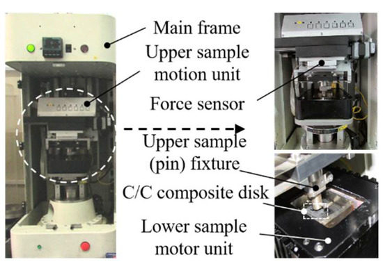 Based on the ASTM G99-04 test method of the pin-on-disk friction test, a reciprocating tribological tester was used to conduct the sliding friction and wear test, as shown in Figure 4. The testing machine consists of the main frame, upper sample motion unit, upper sample fixture, lower sample motor unit, and the force sensor. Before the test, the friction surface of the C/C composite disk was polished by using 800# waterproof abrasive paper, and the steel pin was also processed by pre-grinding against the abrasive paper for 5 min. The contact surface roughness of the C/C composite disk and steel pin was 3.2 μm. The samples were de-greased with acetone to calibrate their initial state. Then, the C/C composite disk sample adhered to the lower sample table. After the tester was started, the loading parameters and motion parameters were set through the computer software control panel. The servo mechanical system drives the upper sample module and completes loading, and controls the reciprocating motion of the lower sample drive module. The test was performed for 3600 s. During the test, the steel pin sample was fixed, and the C/C composite disk sample moved linearly with a reciprocating distance of 12 mm.