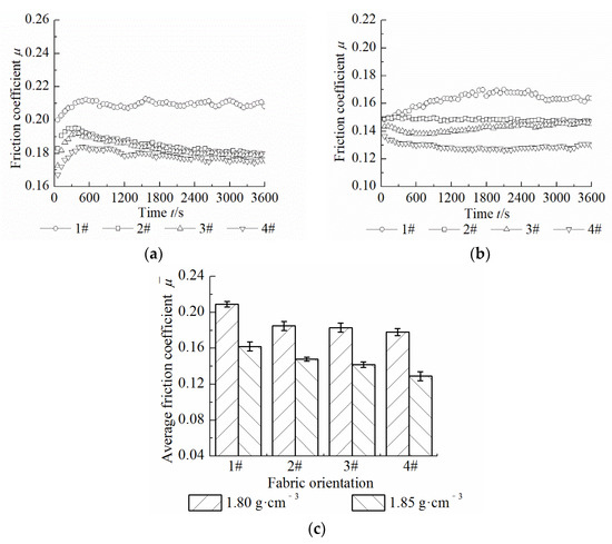 Effect of material density and fabric orientation on friction coefficient. (a) 1.80 g·cm−3; (b) 1.85 g·cm−3; (c) Average friction coefficient.