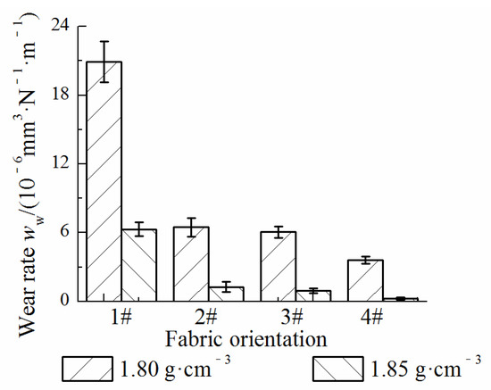 When the material density is 1.80 g/cm3, the friction coefficient with a 1# orientation fluctuates slightly and has the largest value, while the initial value of the friction coefficient with 2#, 3#, and 4# orientations is larger and then gradually decreases and tends to be stable, and the difference also gradually decreases. For the higher material density (1.85 g/cm3), the friction coefficient with a 1# orientation fluctuates greatly and has the largest value, and it changes slightly and is lower with 2#, 3#, and 4# orientations. In addition, the friction coefficient with a 4# orientation is lower than that of materials with 2# and 3# orientations. It can be seen that the average friction coefficient of the material with a higher density is lower than that of the material with a lower density. The wear rates of materials with different orientations are in the order of 1# > 2# > 3# > 4#, among which the wear rates of materials with 2#, 3#, and 4# orientations are similar. Under the same fabric orientation, the wear rate of the material with a density of 1.85 g/cm3 was lower than that of the material with a density of 1.80 g/cm3.