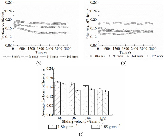 Effect of sliding velocity on friction coefficient. (a) 1.80 g·cm−3; (b) 1.85 g·cm−3; (c) Average friction coefficient.