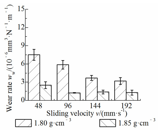 The effects of the sliding velocity on the friction coefficient and wear rate of C/C composites with two densities are shown in Figure 9 and Figure 10. The dynamic friction coefficients of materials with two densities are the highest at the sliding velocity of 48 mm/s. At 96 mm/s, 144 mm/s, and 192 mm/s, the dynamic friction coefficient of the material with a low density (1.80 g/cm3) gradually decreases with time and tends to be stable, and decreases with the increase in the sliding velocity. The dynamic friction coefficient of the material with a high density (1.85 g/cm3) fluctuates slightly with time and tends to be consistent with the velocity varied from 96 mm/s to 192 mm/s. Figure 9c shows that the friction coefficient decreases with the increase in the sliding velocity. It can be seen from Figure 10 that the wear rate of the low-density material decreases significantly, while the wear rate of the high-density material decreases first and then tends to be stable. Compared with the effect of the load on the wear rate of the material, the effect of sliding velocity on the wear rate is much smaller.