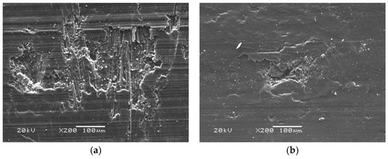 The temperature of the friction surface increases with the increase in the sliding velocity, which leads to the decrease in the micro convex peak’s shear strength and the alleviation of wear. At the same time, it is easier to form a complete and continuous transfer film under high-temperature conditions, thus reducing the friction coefficient. It is noted that the material with a higher density is more likely and rapidly to form transfer films with an increasing sliding velocity. The transfer film layers move with the reciprocating sliding and friction action without a large amount of transfer films peeling off. As a result, the wear rate has little change. By comparing Figure 12a,c and Figure 13a,b, it can be seen that the materials with a low-density form transfer the film slowly at low sliding velocities (Figure 13a). The thin transfer film covers and wraps the fiber, and there are small cracks and more furrows on the surface under the plowing action of the abrasive particles. At this time, because the friction surface temperature is low, the shear strength of the micro convex peak is high, and the incomplete and discontinuous transfer film generated by the extrusion of the wear debris makes the friction coefficient larger and aggravates the material wear. When the sliding velocity is low (Figure 13b), although the material with high-density forms transfers the film slowly and the thin film is partially peeled off, the tight arrangement and less fracture of the fiber bundles alleviate the friction and wear. This makes the wear less than that of the material with a low density. For the material with high density, under high sliding velocity (Figure 12c), the surface of the material is flat, and the wear degree is relatively small.