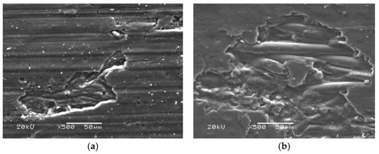 The tribological properties of the two density materials show different trends with the load, and this can be further analyzed and explained from the SEM images of the wear surface, as shown in Figure 12. For the sample with a density of 1.80 g/cm3, when the load is low, the brittle fracture occurs first because of the low strength and toughness of the carbon matrix. Fine granular wear debris is formed and compressed to form a transfer film with cracks (Figure 12a). With the increase in the load, the micro peaks on the friction surface are embedded into each other. Under the combined action of shear stress and compressive stress, the micro peaks break off and peel off (Figure 12b), and the wear debris is rapidly compressed and forms a transfer film on the friction surface. Cracks are formed at the positions where the material is weak or has defects. With the further expansion of the cracks, large transfer films are squeezed out from the friction surface and peeled off. Exposed fibers break under the reciprocating sliding shear action. At the same time, the stress concentration at the fiber end and the debonding between the fiber and the matrix occur, resulting in obvious warping. The broken fiber debris enters the friction surface, which increases the friction resistance and friction coefficient. The fiber debris is gradually crushed, compressed, and coated on the exposed and damaged surface, again forming a sub-friction layer. This self-repairing function plays a lubricating role and reduces the friction coefficient of the material. Under the influence of the above comprehensive factors, for a low-density sample, the friction coefficient fluctuates with the increase in the load, and the wear rate rises sharply. The material with a higher density (Figure 12c,d) has a relatively flat wear surface and higher connection strength between the fiber and matrix, so the friction coefficient and wear rate are low. With the increase in the load, the contact area of rough asperities increases, and the wear debris generated by the plowing action form a transfer film. Under this condition, adhesion has a greater influence on the friction properties of material compared with the deformation and fracture effects of asperities, and the wear rate increases slowly (see Figure 12d). Under the action of the friction shear stress, the transfer film is squeezed out of the friction surface again as lamellar or scaly wear debris, and the wear of the material under different loads has little difference.