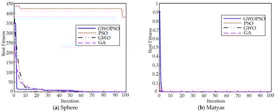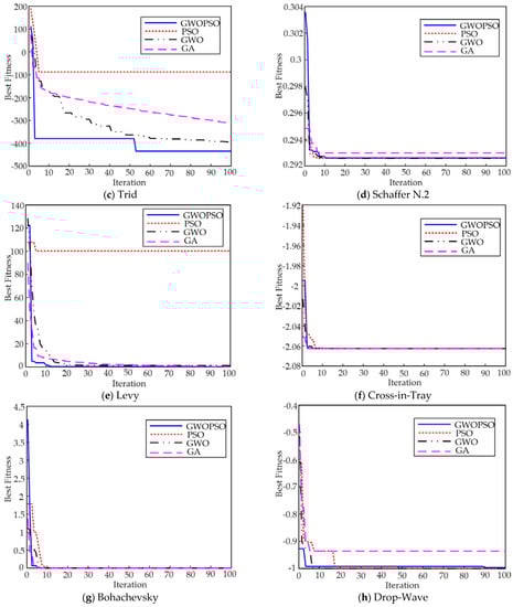 The GWOPSO algorithm is used to optimize the eight benchmark functions and is contrasted with the conventional PSO algorithm, GWO algorithm, and GA algorithm. These algorithms have been shown to have a good optimization performance and have been implemented in a variety of sectors of study and engineering [38]. Therefore, comparing the GWOPSO algorithm proposed in this paper with it can verify whether the GWOPSO algorithm has superiority in optimizing the performance.