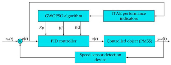 Finding the PID controller with the optimum performance may be done by solving the three parameters tuning issue as a sort of optimal search problem for the three independent variables. The ITAE is converted into an objective function and the three PID parameters are labelled as the coordinate locations of the particles in space. The three parameters of the PID controller are determined after the GWOPSO algorithm is performed and the ideal objective function’s ITAE is derived. The ITAE function’s minimum value in the algorithm design is used to determine the best PID parameters during the iterative update procedure. The best particle position is chosen as the final PID parameter if the PID controller’s controllability satisfies the criteria of the engineering application. Figure 5 depicts the GWOPSO optimized PID control’s basic operation. The error value e(t) between the real-time speed detected by the speed sensor and the target speed is input to the PID controller and the ITAE performance indicator. The GWOPSO algorithm finds the optimal PID parameters by seeking the performance indicator. The PID controller operates on the error with the optimal parameters to obtain the controller output u(t), which is the input to the PMSS, to realize the constant speed control of the PMSS.