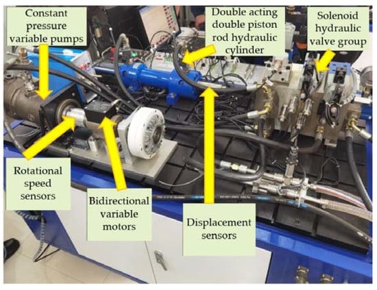 Subject to a certain degree of measurement error, it was assumed in this study that the experimental results accurately represented the behavior of the hydraulic system under test. The simulation error is also constrained and falls within an established acceptable range [43]. As depicted in Figure 6, a simulation model was built with rotational speed serving as the system’s feedback. To validate the simulation model, a PMSS test bench was established, as shown in Figure 7. The hydraulic pump provided oil to the operational system, and the pilot pressure ranged from 0 to 35 bar. To measure the piston displacement, a pull-wire displacement sensor was installed externally on one side of the hydraulic cylinder. The motor swash plate’s initial position is locked during the experiment, and the speed sensor records the motor’s actual speed. The analogue signals from the displacement and speed sensors are converted into digital signals for the controller through a high-speed data acquisition module. The controller regulates the opening size of the solenoid valve according to the motor’s speed, which leads to a change in the extension length of the hydraulic cylinder piston rod and realizes the adjustment to the motor speed. Table 6 displays the technical specification of the aforementioned measuring equipment.