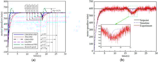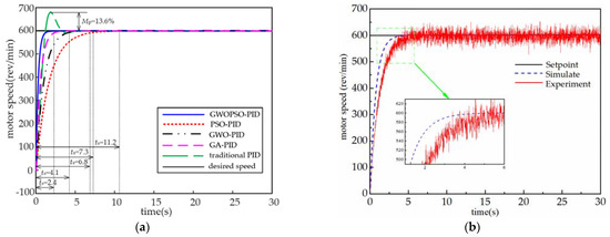 - The GWOPSO-PID control PMSS simulation study and experimental verification. The system’s adjustment time to reach a steady state under no-load conditions is decreased by 78.6%, 64.7%, 67.1%, and 41.5%, respectively, compared to the conventional PID control, GWO-PID, PSO-PID, and GA-PID. The system responds more quickly.