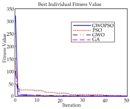 Given the specification requirements of the experimental system, the controller should be designed to minimize the occurrence of a machine overload. In order to reduce cost losses, the GWOPSO algorithm operates under a non-linear constraint, thus determining the next sequence of the particle’s movements [42]. The PSO, GA, and GWO algorithms are also contrasted with the GWOPSO algorithm during the same period. To accomplish the concept of equity while comparing the four algorithms, the number of cycles, the scope of the parameter settings, and the optimal solution are adjusted to be under identical conditions. The following are three fundamental components that were used to evaluate the developed PID controller: