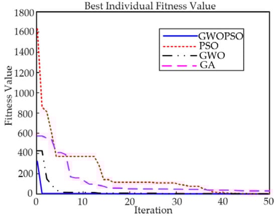 The fitness mean and standard deviation in Table 5 reflect the convergence accuracy and stability of different algorithms under a given number of independent runs, respectively. The bold data in the table are the best test results. Figure 4 shows the optimal convergence curve of each algorithm on the benchmark function so that the constriction performance of the four methods may be compared intuitively. Through Table 5 and Figure 4, it is shown that on the unimodal function f1–f4, the GWOPSO algorithm maintains a high constriction rate from the beginning of the iteration and obtains the global optimum of the functions f3 and f4. For the functions f1 and f2, the optimization accuracy of the GWOPSO algorithm is second only to the GWO algorithm, but the GWOPSO algorithm has a faster convergence speed. At the same time, the standard PSO algorithm is trapped in the local optimum on these functions. The GWOPSO algorithm not only discovers the global optimum but also outperforms the other three algorithms in terms of the search accuracy, as indicated by the std and mean of the function f4 in Table 5. Moreover, Figure 4d illustrates the GWOPSO algorithm’s excellent convergence speed for the function f4. On the multimodal functions f5–f8, the average fitness of the GWOPSO algorithm is smaller than that of the standard PSO algorithm and has a better stability. The convergence accuracy of the functions f5 and f7 is greatly improved, which indicates that the introduction of the GWO algorithm into the PSO algorithm is effective in improving the optimization accuracy of the original algorithm. For the f6 function, the four algorithms have successfully obtained the theoretical optimal solution, but according to the convergence curve in Figure 4f, the GWOPSO algorithm has the fastest constriction rate.