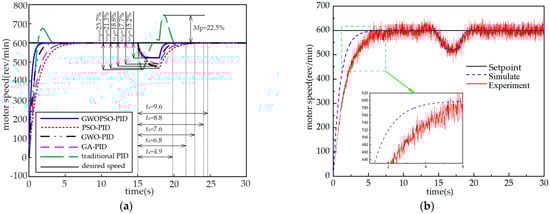 As can be seen from Figure 8a, under conventional PID control, the motor speed reaches a steady-state regulation time of ts = 7.3 s with an overshoot of Mp = 13.6%, while under the GWOPSO-PID control, the system reaches a steady-state regulation time of only 2.4 s, a reduction of 67.1% compared to the conventional PID control, and no overshoot occurs. In addition, the GWOPSO-PID reduces the motor speed adjustment time by 64.7%, 78.6%, and 41.5% compared to the GWO-PID, PSO-PID, and GA-PID controls, respectively. To confirm the research observations, the aforementioned simulation results were validated using the PMSS actual architecture. The experimental system adopts the same GWOPSO-PID controller and the experimental results are shown in Figure 8b. The presence of equipment, manpower, and poor materials led to errors between the experimental system and the mathematical description. As a result, the experimental system responded slightly slower than in the simulation model and produced small oscillations in the step response tracking performance test at no load. Figure 9 displays the iteration curve for the ITAE. GWOPSO has the greatest exploring efficiency among the four methods, according to the ITAE iteration curve, demonstrating the best promotion capabilities.