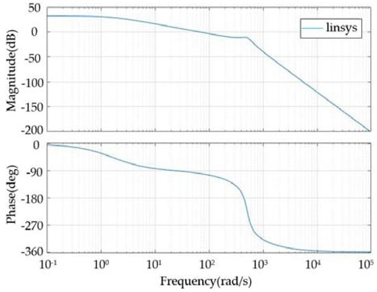 It can be seen intuitively from Figure 12 that the actual speed of the motor is the same as the expected speed when the steady state is reached under the sudden-varying load state and the system loses speed at the moment of sudden-varying load loading. The conventional PID controlled PMSS has problems such as a large overshoot and long adjustment time. The GWOPSO-PID controller effectively improves the above situation. Additionally, compared to the GWO-PID control, PSO-PID control, and GA-PID control, GWOPSO-PID control reduces the amount of system speed loss ωp by 3.6%, 6.1%, and 2.5%, respectively, and the rebalancing regulation time ts by 35.5%, 44.3%, and 27.9%, respectively. The box plot displays the system stability by calculating the ITAE graphical dispersion. It can be seen from Figure 13 that the ITAE calculated by GWOPSO-PID has the smallest outlier and the lowest dispersion degree in all of the algorithms, which demonstrates that the GWOPSO-PID has an outstanding balance. The results further confirm the excellent robustness of the GWOPSO-PID controller. In addition, to further emphasize the stability of the GWOPSO-PID controlled PMSS, Figure 14 shows the Bode plot of the system. The Bode plot is closely linked to the time-domain response and visualizes the response characteristics of the input and output of the whole system. By adjusting the shape of the Bode plot, the design and verification of the controller can be realized. From Figure 14, we can visualize that the crossing frequency of the system is 28.2 rad/s, the phase margin is 86.1°, and the gain margin is 28.7 dB. When the open-loop logarithmic amplitude-frequency characteristic curve reaches the 0 dB line when its logarithmic phase-frequency characteristic curve is still above the −180° line, i.e., the phase is less than −180°, then the closed-loop system is stable.