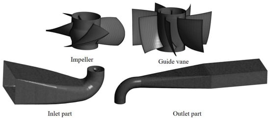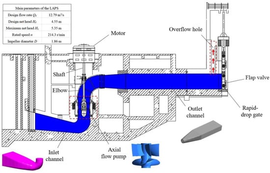 At present, the progress of research on different hydraulic machinery systems is very uneven, and most of the research results are concentrated on hydropower stations, pumped storage power stations and centrifugal pump stations. The research on the transition process of the LAPS is almost non-existent [14,15,16,17]. On the one hand, the related research of the LAPS started relatively late, on the other hand, the problem of the transition process of the LAPS has its particularity [18,19]. Firstly, the inlet system and outlet system of the LAPS are distorted and irregular short pipes, and most of them are cast-in-place reinforced concrete structures, so water compressibility, wave propagation and pipeline elasticity cannot be the decisive factors of the transition process. Secondly, the core content of the dynamic process research of the LAPS is not to study the abnormal water hammer pressure in the system, but to establish the relationship between the characteristic parameters of the pump unit to prevent overload and lack of control [20,21,22].