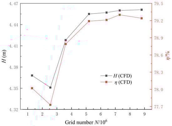 Before the simulation based on Flowmaster was carried out, the pressure drop characteristics of the inlet and outlet channels were calculated by CFD method (based on ANSYS CFX 17.2 software). The grid diagram of the core components of LAPS is shown in Figure 2, which has been densified at the blade shroud. The impeller and guide vane are divided by structured grids, and the other parts are divided by unstructured grids. Figure 3 shows the grid independence analysis of the head and efficiency of LAPS under the design flow condition during the steady-state condition. It can be seen that when the total number of grids increases to 5.16 million, the head and efficiency are basically stable and meet the requirements of grid independence. In order to save calculation time and cost, the scheme in this paper is simulated numerically with the number of grids set at 5.16 million. Table 1 shows the number of grids and nodes of each flow passage component. It can be seen that the number of grids and nodes of the inlet channel is 1,083,798 and 191,421 respectively, and the number of grids and nodes of the outlet channel is 910,224 and 158,193. The CFD calculation is based on the Reynolds time-averaged N-S equation, which is discretized by the finite volume method and the SIMPLEC algorithm [29,30,31]. The pressure term is in the standard format, and the momentum, turbulent kinetic energy and dissipation rate terms are in the second-order upwind scheme. For the setting of boundary conditions, velocity inlet conditions and free outflow conditions are used as inlet and outlet boundary conditions, respectively.