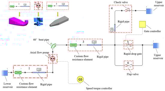 A simulation model based on the Flowmaster platform was built after secondary development. Figure 5 shows the simulation model platform involving all components such as the overflow hole, flap valve and rapid-drop gate. Among them, element 1 and element 3 represent the inlet and outlet channels, which were realized in the form of self-defined flow resistance elements and rigid pipes. Element 2 represents the hydraulic model of the LAPS, and the pump speed control was realized by the pump speed controller. Element 4 represents the overflow hole, which was realized in the form of a rigid pipe and check valve. Element 5 represents the rapid-drop gate, and the gate control was realized by the gate controller. Element 6 represents the flap valve attached to the rapid-drop gate. It should be noted that in the study method used this paper, the simulation models of different schemes can delete the elements not involved, according to need.