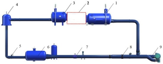 Schematic diagram of the high-precision hydraulic machinery test bench. 1. Intake tank. 2. Tested pump unit and drive motor. 3. Pressure outlet tank. 4. Bifurcation tank. 5. Condition regulating gate valve. 6. Voltage regulating rectifier. 7. Electromagnetic flowmeter. 8. System forward and reverse operation control gate valve. 9. Auxiliary pump unit.