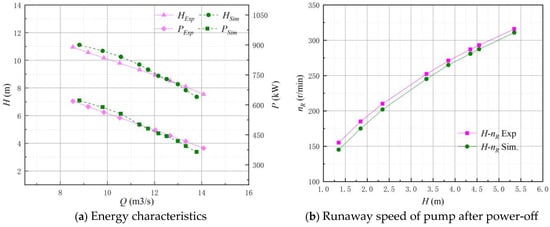 Figure 9 shows the comparison between the experimental results and the simulation results [40,41]. Figure 9a shows the energy characteristics, and Figure 9b shows the runaway speed of the pump after power-off. From Figure 9a, it can be seen that the experiment head and shaft power were very close to the simulation head and shaft power, and the maximum error was less than 5%, indicating that the steady simulation of the LAPS based on the numerical model in this paper has high accuracy. From Figure 9b, it can be seen that the runaway speed of the pump after the power-off of the LAPS under the different heads was very close to that of the simulation, the variation law was highly consistent and the maximum error was less than 3%, indicating that the transient simulation of the LAPS based on the numerical model in this paper also has high accuracy [42,43].