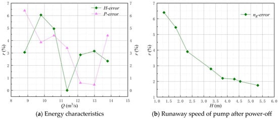 Figure 10 shows the error analysis of numerical simulation. From the error of head and shaft power in Figure 10a, it can be seen that with the increase of flow, the error value of head and shaft power obtained by numerical simulation gradually decreased. At the design flow, the error of head was about 3.0%, and the error of power was about 0.5%. From Figure 10b, it can be seen that the error value of runaway speed obtained by numerical simulation gradually decreased with the increase of head. At the design head, the error value of runaway speed was about 2.0%.
