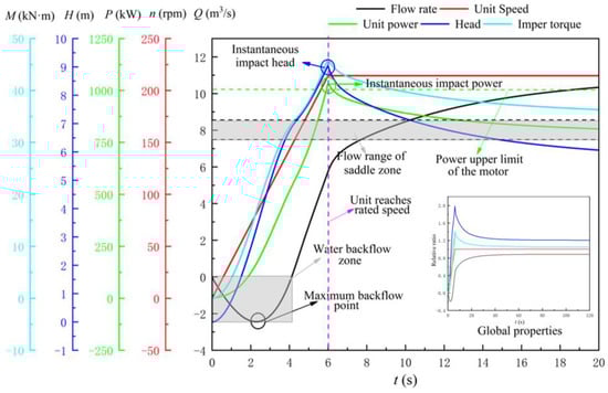 According to the field operation experience of the LAPS, if the start-up control mode or safety auxiliary facilities of the LAPS are unreasonable, its start-up will easily fail. There are two most common main reasons for start-up failure of the LAPS [23,24,25]. Firstly, the LAPS falls into the saddle zone of the axial flow pump during the start-up process, which leads to the instability or even failure of the start-up of the LAPS. Secondly, during the start-up of the LAPS, the instantaneous impact power exceeds the maximum power limit of the unit, which leads to the overload of the unit and the failure of the start-up. Therefore, whether the LAPS falls into the saddle zone of the axial flow pump during the start-up process, and whether the instantaneous impact power is overloaded, are the core factors in reviewing whether the transition process of the LAPS is safe [26,27,28]. At the same time, because the backflow in the LAPS will cause impact and damage to the pump blade at the initial stage of the start-up of the LAPS, parameters such as the maximum backflow flow (MBF) and backflow duration of the LAPS during the start-up process are also worthy of attention.