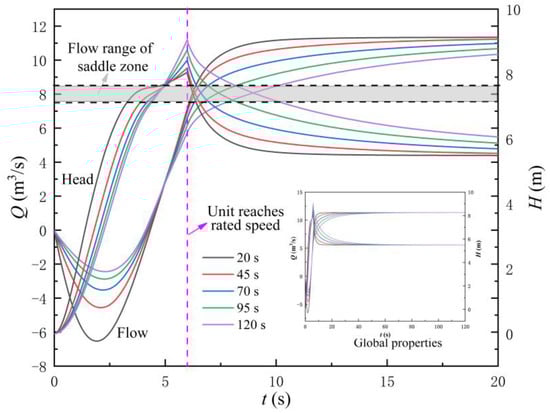 Figure 12 shows the variation law of flow rate and head under different times required for gate opening (TRRO). From Figure 12, the following conclusions can be drawn. Firstly, no matter which TRRO is adopted, the corresponding instantaneous flow rate is not within the flow range of the saddle area when the LAPS reaches the rated speed, so the start-up of the LAPS cannot be unstable due to the influence of the saddle zone. Secondly, no matter which TRRO is adopted, the instantaneous impact head in the LAPS reaches the maximum when the unit reaches the rated speed, but the slower the gate opening speed is, the faster the increasing speed of the pump head is, and the greater the maximum instantaneous impact head is. Thirdly, the slower the gate opening speed is, the more favorable it is for reducing the backflow and the duration of backflow at the initial stage of the start-up of the LAPS. It can be observed that with the increase in the TRRO, the maximum backflow flow (MBF) in the start-up process of the LAPS gradually decreases, and the duration of the backflow state in the LAPS is also gradually shortened.