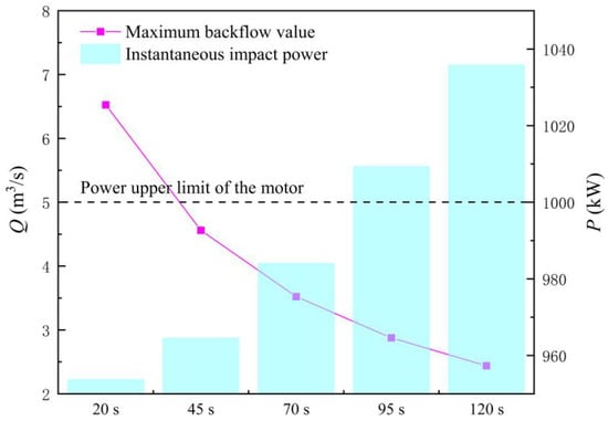 Maximum backflow flow and instantaneous impact power of the large axial flow pump system with different times required for gate opening.