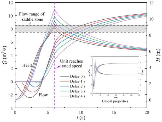 From Section 4.1, it can be found that in the initial stage of the start-up of the LAPS, if the rapid-drop gate and the motor are opened synchronously, backflow will occur in the LAPS, which will cause impact and damage to the pump blade. This section studies the influence of delaying opening time of the rapid-drop gate in the start-up process characteristics of the LAPS.