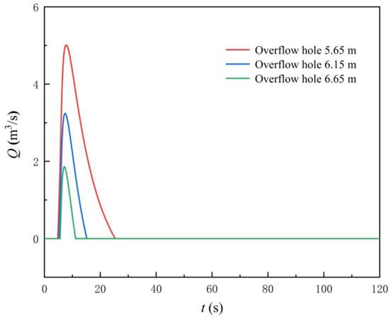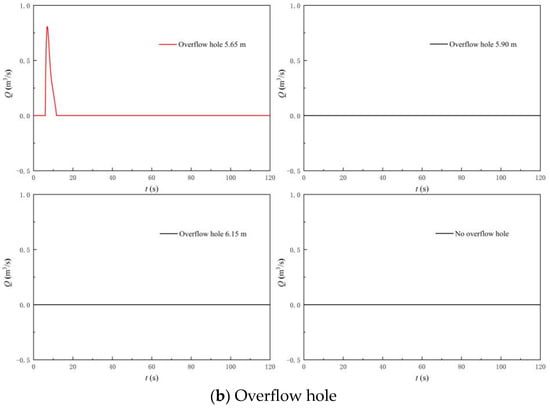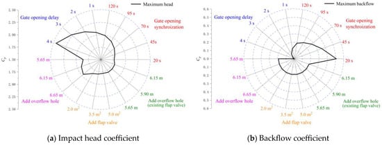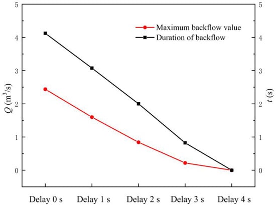 Figure 15 shows the MBF and backflow duration of the LAPS with the different TOOD. The following conclusions can be drawn from Figure 15. Firstly, with the delay of the rapid-drop gate opening, the MBF of the LAPS gradually decreases, and the backflow duration of the LAPS continues to shorten. When the TOOD = 1 s, the MBF in the LAPS is 1.60 m3/s, and the duration of backflow is 3.08 s. When the TOOD = 4 s, the MBF and the duration of backflow in the LAPS are 0, indicating that the backflow in the LAPS disappears completely. Secondly, when the TOOD = 2 s, the decreasing rate of the MBF and backflow duration in the LAPS tend to be linear, and when the TOOD is more than 2 s, the decline rate of the MBF and backflow duration in the LAPS slows down gradually.