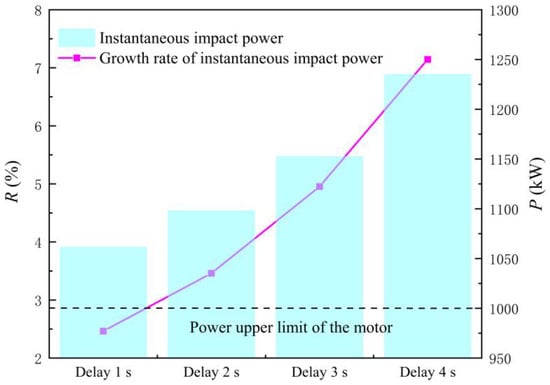 Figure 16 shows the IIP and the growth rate of the LAPS with different TOOD. The following conclusions can be drawn from Figure 16. Firstly, the opening of the rapid-drop gate lags the opening of the motor, which will bring great risk to the start-up of the LAPS. With the delayed opening of the rapid-drop gate, the IIP of the unit increases rapidly. The IIP of the unit is 1061.4 kW when the TOOD = 1 s, and the IIP of the unit has reached 1234.89 kW when the TOOD = 4 s, which far exceeds the upper limit of the motor power. Secondly, the longer the opening of the rapid-drop gate lags the opening of the motor, the faster the IIP growth rate of the unit will rise. When the TOOD = 1 s, the growth rate of the IIP of the unit is 2.46%. When the TOOD = 4 s, the growth rate of the IIP of the unit has jumped to 7.15%.