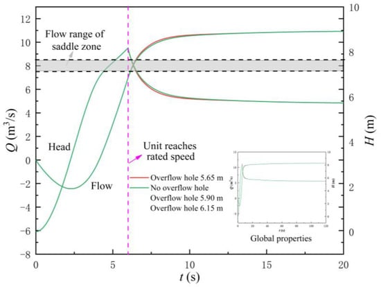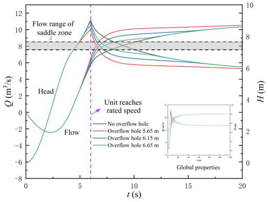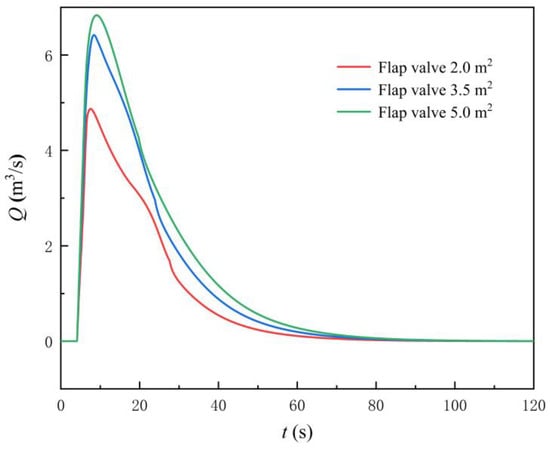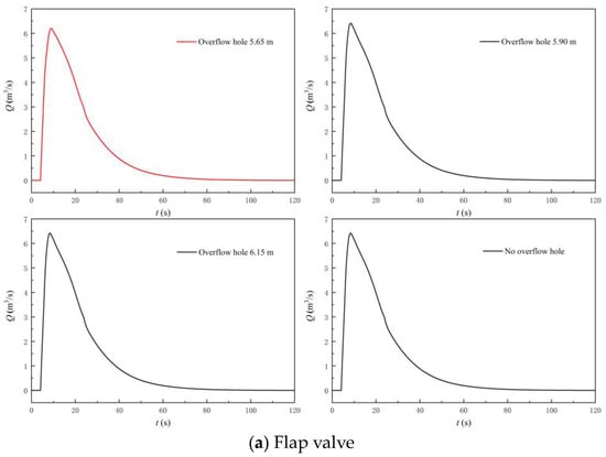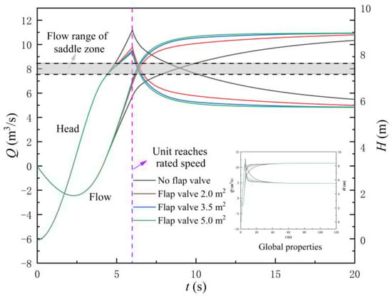 Figure 17 shows the variation law of the flow rate and head of the LAPS after adding the flap valve. Figure 18 shows the flow rate at the flap valve. The following conclusions can be drawn by combining Figure 17 and Figure 18. Firstly, when adopting the three different areas of flap valve (AOF), the flow rate corresponding to the synchronous speed of the LAPS is not within the flow range of the saddle zone, and the start-up of the LAPS cannot be unstable due to the influence of the saddle zone. Secondly, the addition of the flap valve to the rapid-drop gate will significantly reduce the maximum instantaneous impact head, and with the increase of the AOF, the maximum instantaneous impact head will gradually decrease. Thirdly, the scheme of adding the flap valve is not helpful to shorten the backflow state at the initial stage of the LAPS start-up, and the flow rate variation law of the LAPS with different AOF is basically the same as that without the flap valve. Finally, with the increase of the AOF, the shunt effect of the flap valve in the start-up process is gradually enhanced.