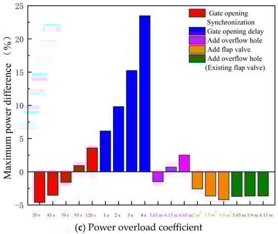 Figure 19 shows the MBF and IIP of the LAPS after adding the flap valve. The following conclusions can be drawn from Figure 19. Firstly, the addition of the flap valve to the rapid-drop gate will weaken the IIP of the unit, prevent the overload of the unit and significantly improve the reliability of the LAPS start-up. When AOF = 2.0 m2 (15% of the area of the gate), the IIP of the unit has been reduced to 974.26 kW, which reduces the 61.62 kW compared with the start-up scheme without a flap valve. With the gradual increase of the AOF, the IIP of the unit decreases gradually. Secondly, the method of adding the flap valve is not helpful to reduce the MBF at the initial stage of the LAPS start-up. No matter how big the AOF is, the MBF of the LAPS is unchanged, consistent with MBF start-up without adding the flap valve, which is 2.44 m3/s.
